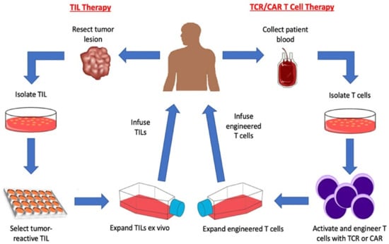 The discovery and therapeutic use of TIL is an early example of adoptive T cell transfer. TIL are present in tumor lesions and are enriched for tumor-reactive T cells. Recent studies indicate that TIL not only contain T cells reactive with shared antigens, but they also contain T cells that target neoantigens [,,]. TIL can function as any normal T cell by lysing tumor cells and/or secreting IL-2, IFN-γ, and other cytokines when stimulated by tumor cells [,]. TIL cultures are generated by first harvesting a tumor lesion, dissociating it into small fragments or a single cell suspension, culturing the cells in IL-2, and expanding them to therapeutic numbers (Figure 1) []. Clinical trials have determined that TIL are efficacious in mediating melanoma regression when adoptive cell transfer of TIL is combined with high dose IL-2 treatment [,]. Historically, TIL have been an effective therapeutic in patients with advanced malignancies, and more recently, TIL have been used to treat ovarian cancer, HPV-associated cervical cancer, renal cell carcinoma, and triple negative breast cancer (Table 1) [,,] Growth of tumor-infiltrating lymphocytes from human solid cancers: summary of a 5-year experience}. TIL treatments have been demonstrated to be clinically advantageous, however, TIL therapy suffers drawbacks. Despite TIL therapy being an effective treatment, the pool of eligible patients, even for melanoma, is very limited because many tumor lesions are not easily accessible (liver, lung, brain, bone marrow, etc.) for TIL harvest. Furthermore, many TIL cultures fail to expand to therapeutic numbers, and those TIL cultures that do expand are not always tumor reactive.