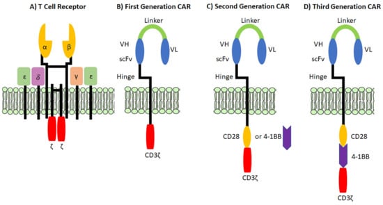 There are two primary distinctions between TCRs and CARs that lead to major differences in their function. Firstly, TCRs target peptide molecules that are bound to MHC molecules expressed on the surface of cells, while CARs target cell surface molecules independent of MHC binding [,]. Secondly, CARs possess all of the molecules required for antigen binding and T cell activation, whereas TCRs are only able to bind to MHC molecules to relay the first signal of T cell activation, meaning that secondary and tertiary signaling is required for T cell activation after the TCR initially binds to antigen [,]. The structural differences between a TCR and various generations of CAR molecules are shown in Figure 2. Although different generations of CARs vary slightly (Figure 2B), there are a few fundamental structures that all CAR molecules possess.