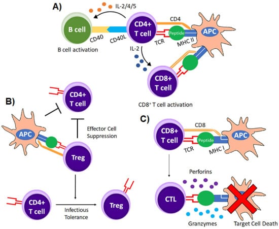 The CD4 coreceptor binds to invariant regions of MHC class II molecules while CD8 interacts with invariant regions of MHC class I molecules, making CD4+ T cells MHC class II restricted and CD8+ T cells MHC class I restricted [,]. The differential expression of CD4 or CD8 on T cells also tends to be a marker for their effector function. While CD8+ T cells can be cytolytic and have a direct effector function, CD4+ T cells mainly regulate immune function by releasing cytokines capable of modulating immune responses (Figure 3A). Helper T cells (Th) promote normal immune function whereas regulatory T cells (TREGs) inhibit normal T cell function (Figure 3B) []. CD8+ T cells are mainly effector cells with their cytotoxic activity directly killing virus infected cells and tumor cells (Figure 3C) []. Unlike most normal cells in the body, T cells can expand in vivo to fight pathogens and in vitro to large numbers, making T cells an excellent choice for adoptive cell transfer in cancer. There have been clinical trials investigating the efficacy of expanding antigen reactive T cells from patient peripheral blood samples, finding that these cells have clinical benefits, however, there are challenges in expanding antigen reactive T cells to clinically therapeutic numbers (Table 1).