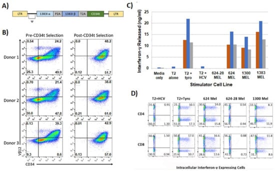 There are two features of our clinical trials worth noting that were novel when the trial was initiated in 2012. First was the use of a novel high affinity HLA-A2 restricted, tyrosinase reactive TCR (TIL 1383I), which was isolated from an MHC class I restricted CD4+ T cell []. We speculated and later confirmed that tumor recognition by the TIL 1383I TCR was CD8-independent making the TIL 1383I TCR the first high affinity human TCR identified [,]. A retroviral vector encoding the TIL 1383I TCR (Figure 4A) was able to efficiently transduce human T cells (Figure 4B). The TIL 1383I TCR transduced T cells specifically secreted IFN-γ when stimulated with HLA-A2+ tyrosinase+ cells (Figure 4C). More importantly, both CD8+ and CD4+ T cells recognized physiologic levels of antigen presented by tumor cells meaning patients were treated with functional CD8+ and CD4+ T cells (Figure 4D) []. Second, a modified CD34 marker gene (CD34t) was added to the vector (Figure 4A) []. This CD34t cassette allowed us to enrich the transduced T cells to >99% purity using anti-CD34 immunomagnetic beads (Figure 4B) and to monitor the transduced T cells in the tissues and blood of infused patients (not shown) []. As of the date of this submission, we have treated 7 patients with advanced melanoma (NCT02870244, NCT01586403) and 13 patients with advanced clear cell renal cell carcinoma (NCT03354390) using CD34 enriched TCR gene modified T cells.