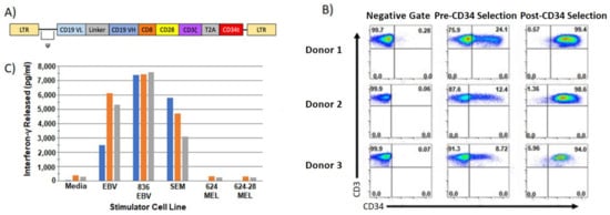 - Norell, H.; Zhang, Y.; McCracken, J.; Martins da Palma, T.; Lesher, A.; Liu, Y.; Roszkowski, J.J.; Temple, A.; Callender, G.G.; Clay, T.; et al. CD34-based enrichment of genetically engineered human T cells for clinical use results in dramatically enhanced tumor targeting. Cancer Immunol. Immunother. 2010, 59, 851–862. [Google Scholar] [CrossRef]