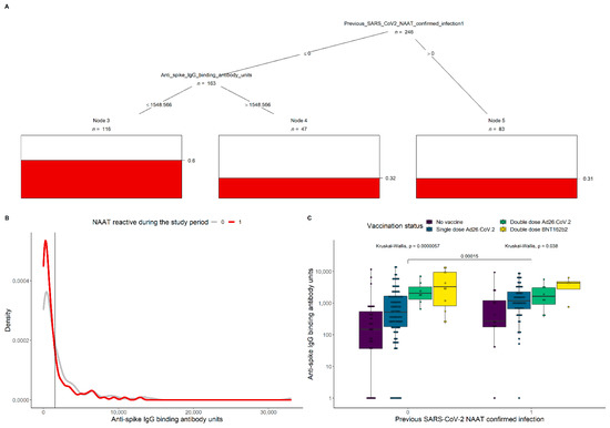 Conditional inference of Omicron infection probability and anti-spike IgG levels by prior SARS-CoV-2 NAAT-confirmed infection. (A) Inferred significant splits in previous SARS-CoV-2 NAAT-confirmed cases and spike IgG levels impact on the probability of having an Omicron infection during the study period (indicated by the red bars). The tree was generated from a training set composed of 90% of all visits with a known serological result. The algorithms infection predictive power was measured to be 72% in the remaining 10% of the data, with 23% type I error. (B) Antibody density distributions for participants with either NAAT-confirmed Omicron infection (red line) or no infection (grey line) during the study period. The vertical black line corresponds to the threshold 1549 anti-spike IgG binding units that emerged from the analysis on panel A. (C) Anti-spike IgG levels by prior SARS-CoV-2 NAAT-confirmed infection and vaccination status. Kruskal–Wallis tests indicate significant differences in IgG concentrations between participants with different levels of prior infection (p = 0.00015), and with more doses of vaccination in those who were not previously exposed (p = 0.000057). A lower significance in differences in IgG concentration for groups with different vaccination status for those who had a prior confirmed SARS-CoV-2 infection (p = 0.038).