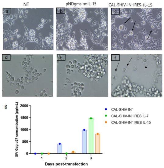 Functional expression of SIV proteins. Co-culture of permissive M8166 lymphocyte cells with HEK 293T cells non-transfected (a), transfected with pNDgms-rmIL-15 (b) or transfected with CAL-SHIV-IN− IRES-cytokines (c). CPEs were observed in the cultures with the CAL-SHIV-IN− IRES-cytokines (black arrows). Supernatants of HEK 293T cells in (a–c) were used to inoculate cultured M8166 in (d–f), respectively. At 24 h post-inoculation, CPEs were observed only in (f) (black arrows). (g) Quantification of SIV Gag p27 by ELISA: Supernatants of HEK 293T cells in a, b and c harvested at days 1, 2 and 3 post-transfection were analyzed by ELISA. Results were expressed in pg/mL.