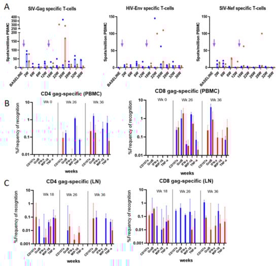 Vaccine-specific T-cell responses in blood and LN mononuclear cells from immunized rhesus macaques: (A) IFN-γ ELISpot responses to Gag, Env and Nef following overnight stimulation. Unstimulated cells were used as negative control for normalization. Median of the 3 animals per group is represented. Arrows indicate immunization times. (B) PBMCs and (C) LN mononuclear cells were used for the ICS assay using the panel of Ab reported in Table 2. Frequencies of Gag-specific cells measured at indicated time points are reported. Median values with 95% CI of the proportion of cytokine-secreting cells are shown. CAL-SHIV-IN− group is presented in blue, and CAL-SHIV-IN− IRES-rmIL-7 + CAL-SHIV-IN− IRES-rmIL-15 in red.