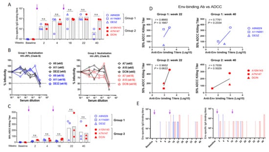 Aside from neutralizing activity, ADCC represents another mechanism able to restrict HIV replication, with ADCC titers correlated with viral control in both macaques and humans [37]. Serum samples of vaccinated macaques were tested for ADCC activity with infectious HIV-1JR-FL virus. Interestingly, Env-specific IgG of both groups showed ADCC activities at weeks 22 and 40 (Figure 5C). However, there was no statistical difference between the values obtained for the two groups. In contrast, a positive correlation was determined between ADCC activity and specific IgG binding titer (Figure 5D). This correlation was stronger for groups 1 and 2 at week 22 (r = 0.86 and 0.99, respectively) than at week 40 (r = 0.77 and 0.70).