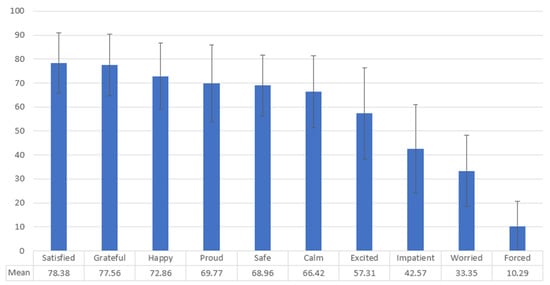 Emotional status (mean) at the moment of vaccination reported by participants (n = 159). Bars show standard deviation.