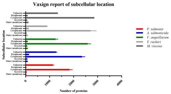 The Vaxign subcellular localization analysis (Figure 2) revealed the number of proteins localized in various bacterial cellular regions. As expected, the cytoplasmic region has the highest number of proteins, while outer membrane proteins (OMPs) and secreted proteins were less abundant. On average, we detected approximately 3146 cytoplasmic proteins, 76 OMPs, and 57 secreted proteins for all bacterial proteomes analyzed in this study. M. viscosa showed the highest number of OMPs and secreted proteins, in contrast to P. salmonis which showed the lowest OMPs and V. anguillarum, which showed the lowest number of secreted proteins.