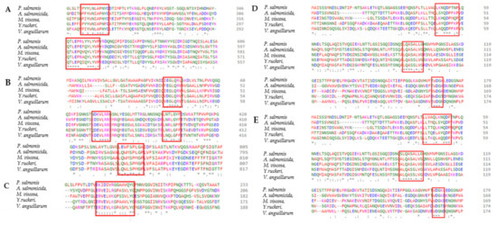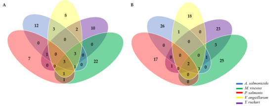 Protein sequences from complete and annotated genomes utilized are listed in Table S1 (See Supplementary File S5). P. salmonis, A. salmonicida, M. viscosa, V. anguillarum and Y. ruckeri proteomes were obtained in FASTA format from National Centre for Biotechnology Information (NBCI) public database (https://www.ncbi.nlm.nih.gov/) (accessed on 10 January 2022).