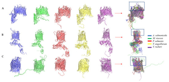 Three-dimensional secondary structures of common Outer membrane antigens showing structural homology for bacterial pathogens used in this study. (A) LPS-assembly protein LptD; (B) outer membrane protein assembly factor BamA protein; (C) TonB-dependent siderophore receptor. The regions of conserved domains are highlighted in the boxes (see Table S5 for a complete list of the conserved regions highlighted).