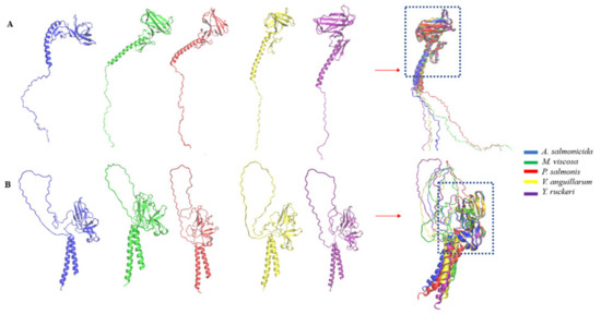 Gram-negative pathogens synthesize several extracellular and secreted proteins including virulence factors like fimbria, secretion systems, and toxins essential for pathogenicity that can serve as effective antigens [77,78]. In this study, we identified antigens that are exposed onto the bacteria outer membrane or secreted to the extracellular milieu (Table S2). Coincidently, some of these proteins such as BamA, LptD, TonB, FlgD, FlgG, aerolysin, hemolysin have been shown to confer immune protection in fish (e.g., Olive flounder, Zebrafish, Catfish, Grouper fish, Turbot,) against Edwardsiella tarda, Y. ruckeri, V. anguillarum, V. alginolyticus and A. salmonicida [58,79,80,81]. Adhesin and antigenic characteristics are also important features of a potential vaccine candidate [49]. Secreted and outer membrane proteins that scored adhesin and antigenic probability values of ≥ 0.51 and ≥ 0.4, respectively, were considered for the development of potential vaccine candidates in this study (Table 2). Five common antigens, including the LPS assembly protein LptD, the outer membrane protein assembly factor BamA, the TonB-dependent siderophore receptor, the flagellar hook assembly protein FlgD, and the flagellar basal-body rod protein FlgG were identified to be conserved across all the strains and species used in this study (Figure 1). These antigens are identical proteins on NCBI across strains of the same species, but a low percentage identity of the antigens across strains of the same species but a low percentage identity of the antigens across different bacterial species used in this study (Table 3 and Table 4). However, we hypothesized that these antigens might have important structural or functional similarities because they have the same protein description (Table 2). Since structural alignments are usually more specific to protein and are more evolutionarily conserved than the amino acid sequence [82], further analyses were conducted to investigate the extent of their structural homology using STAMP on VMD. STAMP has been used to identify the structurally conserved epitope “HAFYLQYKNVKVDFA” among superoxide dismutase homolog structures of Mycobacterium tuberculosis (superoxide dismutase 1IDS), Aspergillus fumigatus (Mn superoxide dismutase 1KKC), and human (Mn superoxide dismutase 2QKC) associated with autoimmune atopic dermatitis [83]. The common proteins identified across all bacterial pathogens in this study were successfully aligned by STAMP on VMD (Figure 4 and Figure 5), which is an indication of homology in their domains. This finding is further supported by the results of the (PSI)-BLAST of the common proteins identified in this study, which showed the presence of similar domains (Table S5). Further analysis of the common antigens revealed a total of 64 novel B cells and T cells epitopes binding to several MHC class I and II alleles (Tables S1 and S4). Sequence alignment of these antigens across P. salmonis A. salmonicida, M. viscosa, Y. ruckeri and V. anguillarum revealed external domains harboring common epitopes (Figure 7 and Table 5) across these bacterial pathogens. These epitopes were predicted using human MHC alleles because the database does not contain fish MHC alleles for teleost. Thus, to evaluate if these epitopes can bind to Atlantic salmon MHC class II, protein-peptide docking was performed to calculate the binding affinities and dissociation constants (Table 5). This analysis showed that these epitopes can successfully bind to MHC class II from Atlantic salmon and could be used for the polyvalent vaccine design against furunculosis, vibriosis, winter ulcerative disease, piscirickettsiosis, and enteric red mouth disease.