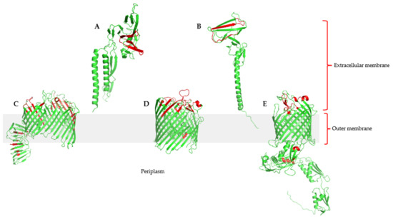 3D visualization of the common outer membrane and secreted antigens showing predicted B and T cell epitopes. (A) Flagellar hook assembly protein FlgD; (B) flagellar basal-body rod protein FlgG; (C) LPS-assembly protein LptD; (D) outer membrane protein assembly factor BamA protein; (E) TonB-dependent siderophore receptor. Immune epitopes are highlighted in red.