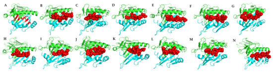 Interactions between Atlantic salmon MHC class II complex and the common epitopes. (A) MHC class II complex of Atlantic salmon; (B) PYYLNLAPNYD epitope docked to MHC class II; (C) QTLEPRLYYLYVP epitope docked to MHC class II; (D) IEGLQRL epitope docked to MHC class II; (E) DEVLARE epitope docked to MHC class II; (F) LNTLGYF epitope docked to MHC class II; (G) LQWMSPLGP epitope docked to MHC class II; (H) EKIDVRGGAAVQYG epitope docked to MHC class II; (I) LKNQDPPTNP epitope docked to MHC class II; (J) LQASALLG epitope docked to MHC class II; (K) WDGNDQNGN epitope docked to MHC class II; (L) LLTQLAQQDP epitope docked to MHC class II; (M) ALQASALVG epitope docked to MHC class II; (N) WDGKL epitope docked to MHC class II; The green domain represents the MHC class II α chain, the cyan domain represents the MHC class II β chain and red peptides for the epitopes. Hydrogen bonds were identified between the epitopes and MHC class II molecules.