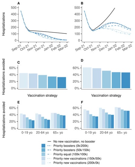 Figure 1. Effectiveness on hospitalizations of vaccination strategies varying in the allocation of 200,000 daily doses between primary vaccination and booster shots, over the period from 1 September 2021 to 1 March 2022, compared to a baseline scenario in which all vaccination is stopped on 1 September 2021. (A,C,E) Vaccine efficacy decreased only for people aged 65 years and older. (B,D,F) Vaccine efficacy decreased for all age groups. (A,B) Daily new hospitalizations, (C,D) proportion of hospitalizations avoided, (E,F) proportion of hospitalizations avoided by age group. A prioritization strategy of (150 k/50 k) means 150 k daily doses for primary vaccination and 50 k daily booster doses until 90% coverage of one target population is reached, then all 200 k daily doses are allocated to the other target population.
