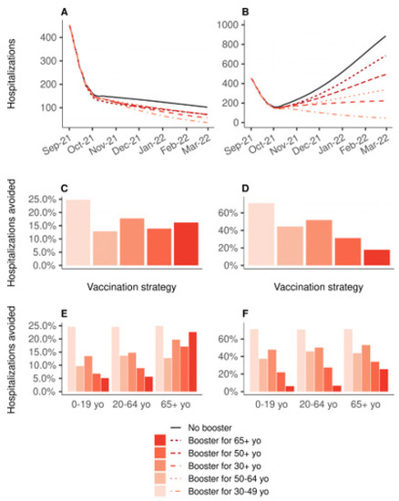 Figure 2 shows the impact on the hospital admissions due to COVID-19 of 10 million booster shots depending on the targeted age groups, over the period from 1 September 2021 to 1 March 2022, compared to a baseline scenario of no booster shots and no primary vaccination. If vaccine efficacy is decreased for all age groups (Figure 2B,D,F), boosting people aged 30 to 49 years would be the most effective strategy, reducing the total number of hospitalizations by 71%, while boosting people aged 65 years or older would lead to an 18% reduction only (Figure 2D). In the other scenario, in which the efficacy is decreased only for people aged 65 years or older, the strategy targeting the 30–49 age group was the most effective, with a 25% reduction. The strategy targeting those 30+, and that targeting those 65+, were next with similar levels of reduction in the total number of hospitalizations: 18% and 16%, respectively (Figure 2C). Figure 3 shows the same analyses regarding the deaths due to COVID-19. If vaccine efficacy is decreased for all age groups, boosting people aged 30 to 49 years would still be the most effective strategy (Figure 3D). However, if vaccine efficacy is decreased only for people aged 65 years or more, a boosting strategy targeting this population would be the most effective at reducing the total number of deaths (Figure 3C).