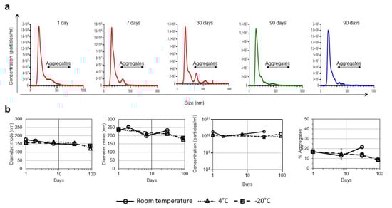 Figure 1. Effect of different storage temperatures in VLPs size and integrity. (a) Particle sizes and population distribution after 1, 7, and 30 days of storage at room temperature (red line); 90 days of storage at 4 °C (green line) and 90 days of storage at -20 °C (blue line) monitored by NTA. Black arrows identify the population of aggregates >300 nm. (b) Particle diameters (average mode and mean values with the corresponding standard deviations), particle concentrations, and percentage of aggregates over time after storage at room temperature, 4 and −20 °C, monitored by NTA. Values are averages and standard deviations of the values obtained in the five videos.