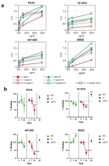Figure 2. B-cell epitope preservation after storage at different temperatures. (a) Antigenicity of VLPs formulated Envs was evaluated by ELISA with a panel of monoclonal antibodies with different specificities. VLPs were normalized by gp120 and immobilized in ELISA plates. (b) Percentage of residual binding to antibodies PG16, 10-1074, 447-52D, and 35022 after different storage times and temperatures. In cases where statistically significant differences were found, p-values are represented as: * p < 0.05; ** p < 0.01; **** p < 0.0001.