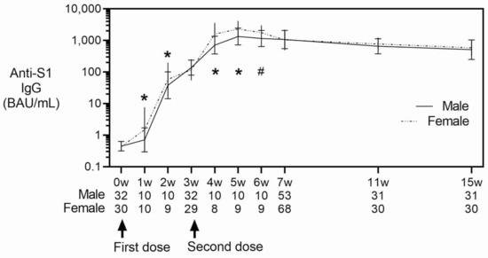 - Wheeler, S.E.; Shurin, G.V.; Yost, M.; Anderson, A.; Pinto, L.; Wells, A.; Shurin, M.R. Differential antibody response to mRNA COVID-19 vaccines in healthy subjects. Microbiol. Spectr. 2021, 9, e0034121. [Google Scholar] [CrossRef] [PubMed]