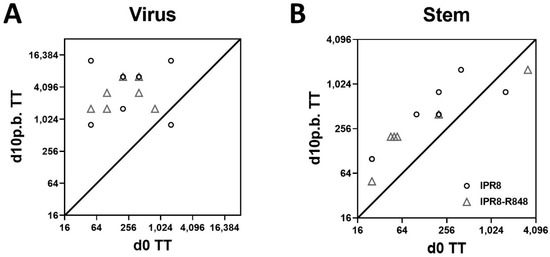 Elderly AGM generates HA-stem-specific IgG in response to vaccination. The levels of circulating IgG were quantified from the plasma of IPR8 (circles)- and IPR8-R848 (triangles)-vaccinated AGM. The d0 threshold titer (TT) for each animal was plotted against the d10 p.b. threshold titer. IgG specific to PR8 (A) or Ca09 trimeric stem protein (B) was measured. TT is defined by the highest dilution at which the sample’s optical density was at least 3 times that of the assay background.
