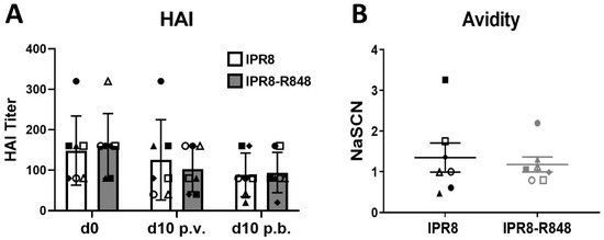 R848 adjuvantation does not improve the neutralizing capacity or avidity of IAV-specific antibodies after prime/boost vaccination in elderly AGM. (A) The neutralizing capacity of IAV-specific antibodies was assessed by HAI assays at d0, d10 p.v. and d10 p.b. Serially diluted plasma was incubated with PR8 for 30 min and then transferred to chicken red blood cells for hemagglutination assessment. HAI titer is defined by the highest dilution at which the sample prevents agglutination. Each animal is designated a distinct symbol; these symbols are consistent across time points to allow for longitudinal visualization of each individual response. IPR8- and IPR8-R848-vaccinated animals are designated by black or grey symbols, respectively. (B) The average avidity of PR8-specific IgG at d21 p.b. was calculated by determining the NaSCN concentration that gave a 50% reduction in optical absorbance compared to the untreated sample. Seven animals were included in each vaccine group, and the averages shown are the mean ±SEM. Statistical significance was determined using a two-way ANOVA with repeated measures and Tukey’s multiple comparisons test (A) or an unpaired two-tailed t-test (B). No statistical significance was observed, and the p-value was >0.05.
