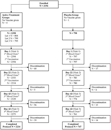 Based on data from previous studies in similar populations, a single equivalence test based on 718 subjects per lot group was determined to have a power of 95% with alpha of 0.025. Taking a dropout rate of approximately 10% into account, a total study enrollment of 3192 subjects (798 subjects per lot) was planned.