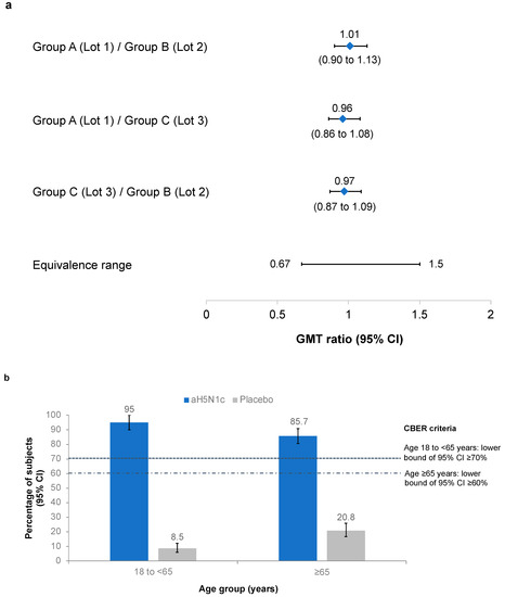 (a) Pairwise comparisons of the geometric mean titer (GMT) ratios of hemagglutination inhibition (HI) titers from Groups A (Lot 1, No.181053), B (Lot 2, No.181054), and C (Lot 3, No.181675). Protocol-defined equivalence range of the 95% confidence intervals (CI) was 0.667 to 1.5. (b) Proportion of subjects with HI ≥1:40 on Day 43 in the pooled aH5N1c and placebo groups. Center for Biologics Evaluation Research (CBER) criteria were met if the lower bound of the 95% CI was ≥70% in subjects aged 18 to <65 years and ≥60% in subjects aged ≥65 years.