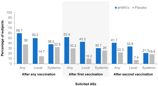 The frequency of any solicited local or systemic AE was comparable between the aH5N1c groups and higher in the active treatment groups than in the placebo group. The proportion of subjects for whom any solicited AE was reported was lower after the second than after the first vaccination in both the active treatment and the placebo groups (Figure 3). In a subgroup analysis by gender, no clinically significant differences in safety endpoints were observed.