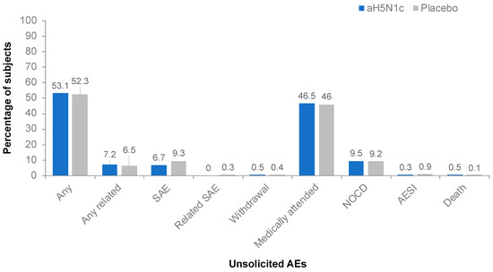 The proportion of subjects reporting unsolicited AEs was similar among those receiving aH5N1c (53.1%) or the placebo (52.3%) throughout the study (Figure 4). The majority of the reported unsolicited AEs were of mild or moderate intensity. No differences in frequency, severity, or nature of unsolicited AEs in the aH5N1c group compared to the placebo group were observed.