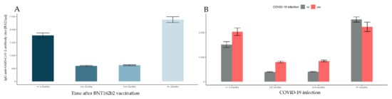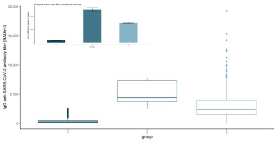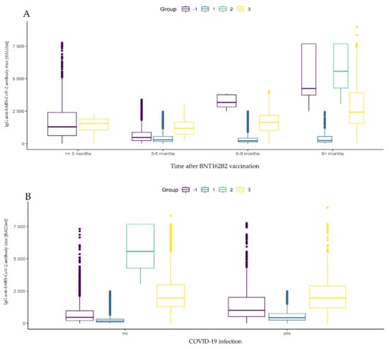 - Group 2—Vaccinated (two doses) more than 6 months before the antibody measurement, high antibodies level (>2500), and no declaration of COVID-19 prior to infections (N = 190). In this group, we observed a significant increase in IgG concentration, probably a consequence of an unconscious (asymptomatic) SARS-CoV-2 infection;