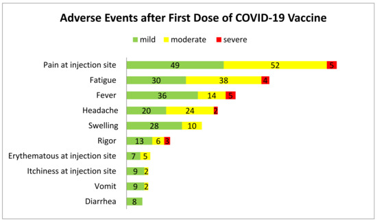 The types of localized AEs reported in this study were comparable to previous reports [7,8,11,13,15]. In particular, there were more local AEs reported after the first dose, compared to the second dose, with the most common local AE being pain at injection site. This was similar to those reported by Menni et al., but their incidence were higher in the second dose (29.2%) compared to the first dose (34.3%) [13]. Only a minority of the respondents rated the pain as severe (9/218, 4.1%) and all reported that it resolved within one week, consistent to other studies [11,15,16]. Nevertheless, we observed a marked difference with two studies among healthcare workers in the United States and Czech Republic, where the AE of pain at injection site was four-fold higher than our study [7,8]. There was a low prevalence (<10%) of other local AE, such as swelling and erythematous after both doses, similar to other studies [11,13].