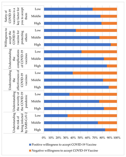 Table 2 shows the awareness of the COVID-19 pandemic and attitudes toward receiving COVID-19 vaccines. The associations between high scores in responding to the items of “understanding the risk of being infected by SARS-CoV-2” (p < 0.001, COC = 0.391), “understanding the severity of the COVID-19 pandemic” (p < 0.001, COC = 0.350), “understanding the effectiveness of COVID-19 vaccines” (p < 0.001, COC = 0.438), “understanding the complications of COVID-19 vaccines” (p < 0.001, COC = 0.340), “willingness to accept the COVID-19 vaccine for protecting others” (p < 0.001, COC = 0.433) and “safety of COVID-19 vaccines is a key factor for you to accept them” (p < 0.001, COC = 0.125) and significant positive willingness to receive the COVID-19 vaccine are shown. The percentages of participants with positive and negative willingness to accept the COVID-19 vaccine for each item are presented in Figure 1.