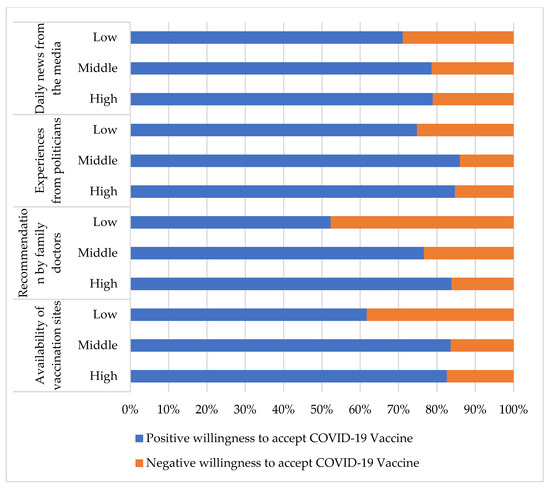 Table 3 reveals possible factors affecting the willingness of elderly individuals to accept COVID-19 vaccines. The associations between participants who had a high score for the variables of “availability of vaccination sites” (p < 0.001, COC = 0.231), “recommendation by family doctors” (p < 0.001, COC = 0.290), “experiences from politicians” (p < 0.001, COC = 0.201), and “daily news from the media” (p < 0.001, COC = 0.202) and a significant positive willingness to receive COVID-19 vaccines were noted. The percentages of participants with a positive and negative willingness to accept the COVID-19 vaccine for each item are presented in Figure 2.