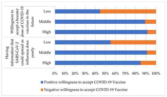 The sections on knowledge of the COVID-19 pandemic and attitudes toward accepting a booster dose of a COVID-19 vaccine (Table 4) demonstrated the associations between a high score for the items “having information that SARS-CoV-2 could spread as influenza does yearly” (p < 0.001, COC = 0.330) and “willingness to accept a booster dose of COVID-19 vaccines in the future” (p < 0.001, COC = 0.451) and positive willingness to accept COVID-19 vaccines in elderly individuals. The percentages of participants with a positive and negative willingness to accept the COVID-19 vaccine for each item are presented in Figure 3.