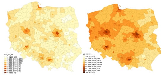 Temporal changes of vaccination rates are visualised for different age classes between 30 June 2020 and 31 January. They are presented in Figure 1 (ages 20–39), Figure 2 (ages 40–59), Figure 3 (ages 60–69) and Figure 4 (ages 70 and above). Some patterns, such as higher vaccination rates in cities and lowest near the eastern border of Poland, seem to apply regardless of the time of observation and of the age group.