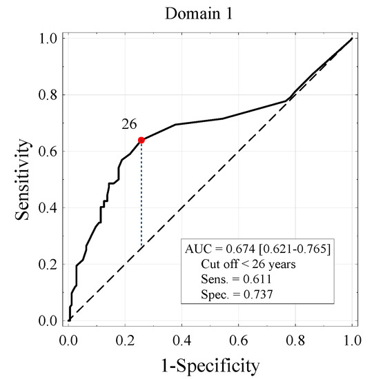 ROC curve for age-based positive domain 1 vaccination estimation. Area under the curve (AUC) and the sensitivity and specificity of the test for the age cutoff <26 years.