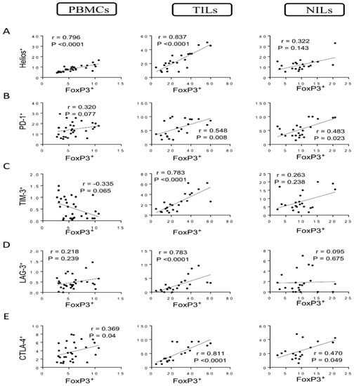 Correlations between levels of FoxP3 and immune checkpoints in CD4+ T cells in CRC patients. Correlations between levels of CD4+FoxP3+ Tregs with Helios+ (A), PD-1+ (B), TIM-3+ (C), LAG-3+ (D), and CTLA-4+ (E) in PBMCs, TILs, and NILs.