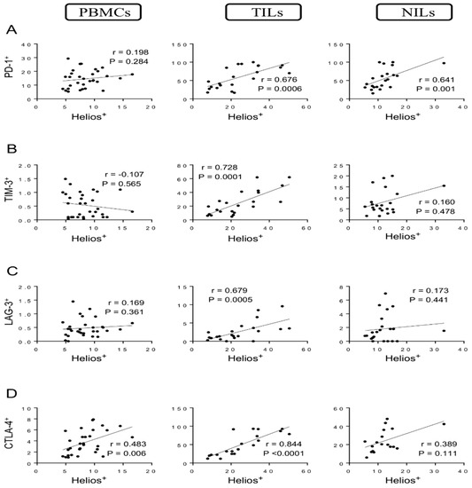 Strong correlations were observed between levels of Helios+ T cells and CD4+PD-1+ T cells in TILs and NILs (r = 0.676, p = 0.0006; r = 0.641, p = 0.001, respectively) but not in PBMCs (Figure 2A). Indeed, a strong positive correlation was found between levels of Helios+ T cells and CD4+TIM-3+ T cells in TILs (r = 0.728, p = 0.0001) but not in PBMCs and NILs (Figure 2B). Similarly, a strong positive correlation was found between levels of Helios+ T cells and CD4+LAG-3+ T cells in TME (r = 0.679, p = 0.0005) but not in PBMCs and NILs (Figure 2C). Furthermore, the following correlations between levels of Helios+ T cells and CD4+CTLA-4+ T cells were observed: a strong positive correlation in tumor tissues (r = 0.844, p < 0.0001), a moderate correlation in circulation (r = 0. 483, p = 0.006), and a non-significant moderate correlation in normal tissues (r = 0.389, p = 0.111) (Figure 2D).