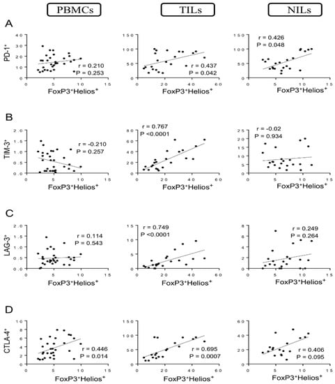 We went further and identified the correlations between different FoxP3+/−Helios+/− T cell subsets with specific IC-expressing CD4+ T cells. We found a moderate correlation between levels of FoxP3+Helios+ Tregs and CD4+PD-1+ T cells in TILs and normal tissues (r = 0.437, p = 0.042; r = 0.426, p = 0.048, respectively) but not in PBMCs (Figure 3A). Moreover, strong positive correlations were observed between levels of FoxP3+Helios+ Tregs with CD4+TIM-3+ T cells and CD4+LAG-3+ T cells (r = 0.767, p < 0.0001; r = 0.749, p < 0.0001, respectively) in tumor tissues but not in circulation or normal tissues (Figure 3B,C). Furthermore, a strong positive correlation was found between levels of FoxP3+Helios+ Tregs and CD4+CTLA-4+ T cells (r = 0.695, p = 0.0007) in tumor tissues (Figure 3D). Indeed, moderate correlations were observed between levels of FoxP3+Helios+ Tregs and CD4+CTLA-4+ T cells in PBMCs and NILs (r = 0.446, p = 0.014; r = 0.406, p = 0.095, respectively) (Figure 3D).