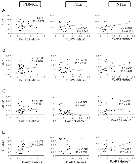Correlations between levels of FoxP3−Helios− and immune checkpoints in CD4+ T cells in CRC patients. Correlation between levels of CD4+FoxP3−Helios− T cells with PD-1+ (A), TIM-3+ (B), LAG-3+ (C), and CTLA-4+ (D) in PBMCs, TILs, and NILs.