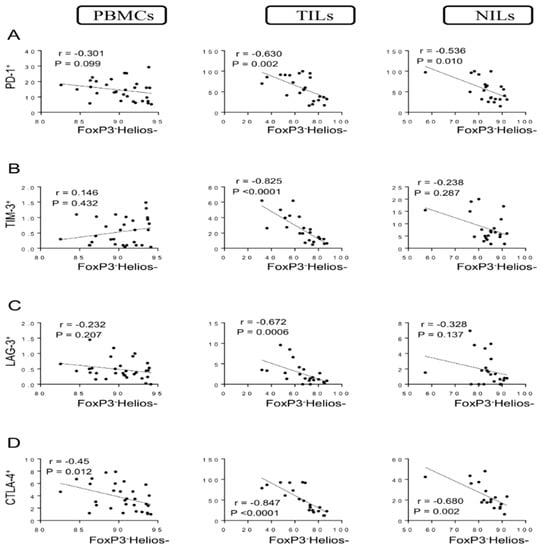 Correlations between levels of FoxP3+Helios− and immune checkpoints in CD4+ T cells in CRC patients. Correlations between levels of CD4+FoxP3+Helios− Tregs with PD-1+ (A), TIM-3+ (B), LAG-3+ (C), and CTLA-4+ (D) in PBMCs, TILs, and NILs.