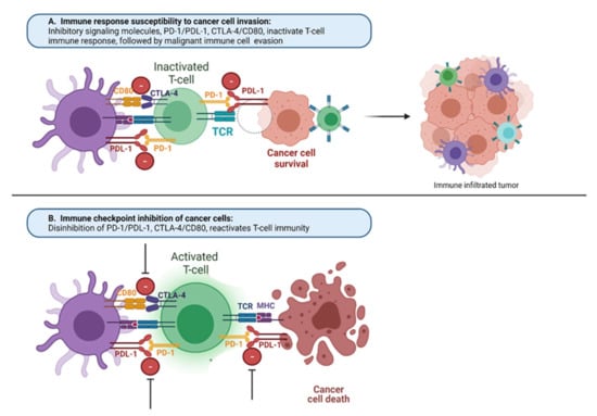 Mechanisms of the immune response under malignancy and with immune checkpoint inhibitors: (A) immune response susceptibility to cancer cell invasion. Common ligands, MHC and PDL-1, found on immune macrophages (purple) and cancer cells (brown) compete with binding to receptors on T cells (green) TCR and PD-1, which normally regulate the immune response. When immunologic homeostasis is compromised between positive (TCR/MHC) and negative (CTLA-4/CD80, PD-1/PDL-1) signaling of T-cell activation, cancer cells can avoid the immune response of the host and escape from immune cell attack, providing cancer cell growth and proliferation uncontrollably; (B) in presence of immune checkpoint inhibitors toward CTLA-4/CD80, PD-1/PDL-1 signaling, there is disinhibition of these pathways and reactivation of T cells toward cancer cell death. MHC, major histocompatibility complex; PD-1, programmed cell death protein 1; PD-L1, programmed death-ligand 1; CTLA-4, cytotoxic T-lymphocyte-associated protein 4; TCR, T-cell receptor.