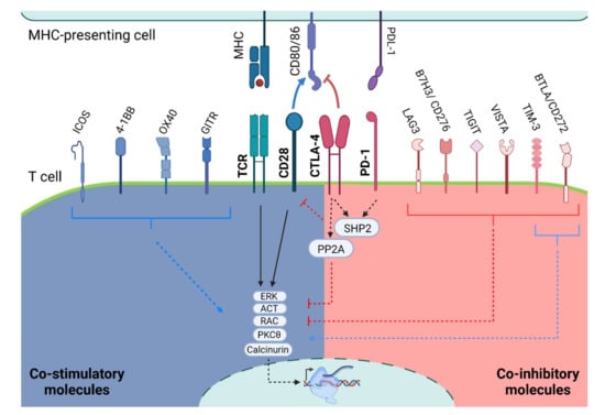 - Kreileder, M.; Barrett, I.; Bendtsen, C.; Brennan, D.; Kolch, W. Signaling Dynamics Regulating Crosstalks between T-Cell Activation and Immune Checkpoints. Trends Cell Biol. 2021, 31, 224–235. [Google Scholar] [CrossRef]