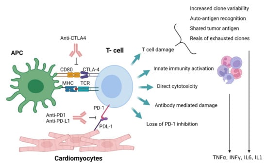 Unfortunately, ICI immune cell activation is not specific or selective to the TME. Systemic immune activation results in a very high incidence of immune-related adverse events (IRAE). Indeed, IRAEs are expected in up to 60% of treated patients [3], most commonly affecting the skin, gastrointestinal (GI) tract, thyroid, and lungs; however, any organ can be affected. Cardiovascular adverse events (CVAEs) from ICIs can manifest in multiple ways, ranging from conduction abnormalities to severe myocarditis [4,5], which is fatal in ~50% of cases [6]. The severity of these reactions, together with substantially increased use of ICIs, make understanding the processes governing IRAEs of great importance. Indeed, protocols have been devised for active surveillance of ICI-treated patients for the early detection of CVAEs to allow early treatment and reduce mortality. These include routine electrocardiogram (ECG) and biomarkers (mainly troponin and N-terminal (NT)-pro-B-type natriuretic peptide (NT-proBNP)), screening during the first weeks of treatment, followed by echocardiography and cardiac magnetic resonance imaging (CMR) in suspected cases [7]. Endomyocardial biopsy, though considered the gold standard for definitive diagnosis of myocarditis, is far from being ideal both in terms of its sensitivity and safety. Sensitivity may be as low as 60% [8] due to the patchy nature of myocarditis, a phenomenon also seen with ICI therapy [9]. The relatively low sensitivity and risks involved combined with the increasing diagnostic performance of other modalities, such as CMR, may make endomyocardial biopsy less necessary in many cases. Although troponin T/I and NT-proBNP were shown to be sensitive [10,11], they are far from being specific. This led to a search of new markers of ICI-related myocarditis, among which are increased neutrophile-to-lymphocyte ratio and decreased absolute lymphocyte count [12]. Additionally, the search for risk factors has shown associations of other IRAEs, such as myositis (odds ratio (OR) 25.5, 95% confidence interval (CI): 18.7–34.9; p < 0.001) and hepatitis (OR 2.9, 95% CI: 1.9–4.5; p < 0.001), pre-existing heart conditions (OR 1.26, 95% CI: 1.2–1.5; p < 0.001), and increased age with the development of cardiotoxicity [13,14]. In this review, we describe the emerging range of ICI-induced cardiotoxicities and address the recent advances in understanding the fundamental processes driving these events.