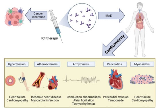 The increased use of ICI therapy has revealed the extent and importance of ICI-induced cardiotoxicity (Figure 4). The severity of cardiac IRAEs is classified according to the American Society of Clinical Oncology [153] and ranges from benign ECG changes to life-threatening myocarditis. Recently, analysis of the Pharmacovigilance database and a meta-analysis of published papers and randomized controlled trials (RCTs) has identified cardiac events in 1.3–5.8% of patients receiving ICIs (single and dual therapy) [154]. Another large meta-analysis of RCTs showed increased odds ratios for developing myocarditis and pericarditis (4.4 and 2.2, respectively) in ICI-treated patients, with increased associated risks of heart failure and myocardial infarction (MI) [155]. Surprisingly, a meta-analysis of RCTs from phase II and III trials did not find any difference in CVAE between ICI-treated and control groups [156]. This may be explained by including highly selected patients in these trials (selection bias), reporting bias, and the type of analysis [155].