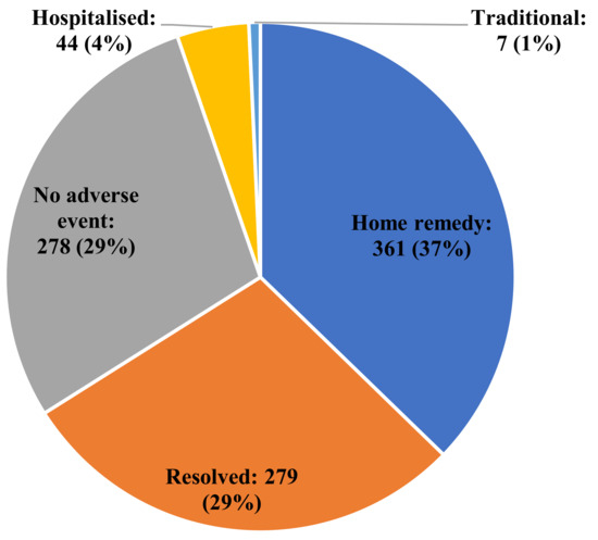 A large proportion of Africans with adverse events following COVID-19 vaccination, 37% (n = 361), managed and treated the reactions at home without any visit to the hospital, while 1% (n = 7) sought the option of traditional remedy (Figure 4).