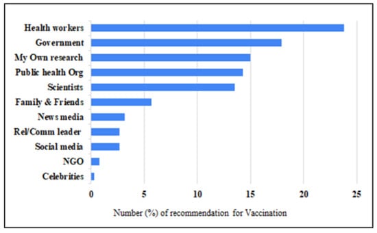Study participants were vaccinated for COVID-19 significantly based on the recommendations given by healthcare workers (23.8%), various levels of governments (17.9%), personal research/investigation (15.0%), public health organisations/institutions (14.3%), and scientists (13.5%). These sources are about 5–10 times greater enablers of COVID-19 vaccination compared to the recommendations received from religious and community leaders (2.7%), social media (2.7%), not-for-profit organisations (NGOs) (0.8%), and celebrities (0.3%) (Figure 5).