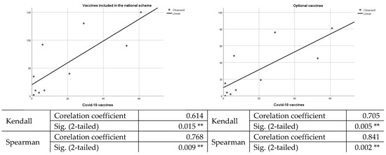 Statistical analysis carried out to determine a potential link between vaccination of children with vaccines included in the mandatory national schedule, optional vaccines, and acceptance of COVID-19 vaccines shows that this hypothesis is rejected, as there is no strong correlation between variables, as shown in Figure 2.