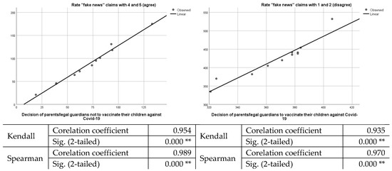 Based on the statistical tests conducted, we consider the hypothesis valid that the level of confidence in “fake news” claims determines the level of vaccination among children. The more parents trust official data and reject “fake news” claims, the greater the acceptance of the COVID-19 vaccine for children.