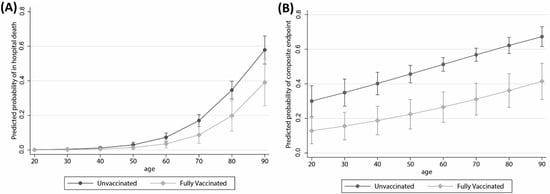 Finally, we evaluated the potential effect measure modification by age. From plotting the predicted probability of developing the primary endpoint obtained from a logistic regression approximating the hazards with the odds, there was a signal for the effect of vaccination to be bigger in participants with older ages (e.g., 41% vs. 59% in the 90 years old vs. 15% vs 18% in the 70 years old) comparing fully vaccinated with unvaccinated. In contrast, we obtained parallel predictions by age strata for the secondary composite endpoint (Figure 3).