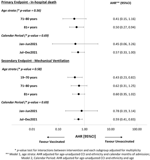 Relative hazards of in-hospital death (panel A) and of the secondary outcome of mechanical ventilation or death (panel B) are shown in Table 5 from fitting an univariable model and after controlling for age, age-unadjusted Charlson index, ethnicity and month of enrolment. In the adjusted analysis, using the unvaccinated as the comparator group, fully vaccinated participants showed a risk reduction of 50% for both the rate of in-hospital death, AHR 0.50 (95% CI: 0.30–0.84) and for the composite endpoint of mechanical ventilation or death, AHR 0.49 (95% CI: 0.35–0.69). Results were similar after controlling for immune-competence instead of CCI (Supplementary Table S1). Of note, even after controlling for confounding factors, there was no evidence for a difference in the hazards of developing the endpoints comparing participants who received only one dose of anti-SARS-CoV-2 vaccine vs. those unvaccinated [primary endpoint AHR: 1.04 (95% CI: 0.63, 1.71); secondary endpoint: AHR 0.83 (95% CI: 0.57, 1.19)].
