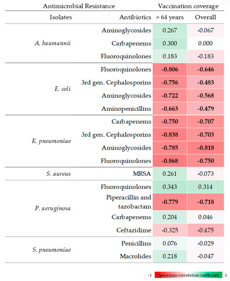 Spearman’s Correlations between influenza vaccination coverage and antimicrobial resistance. Correlations coefficients with p < 0.05 are indicated in bold font.